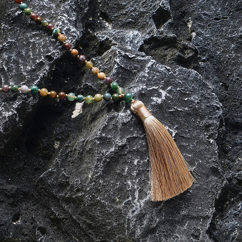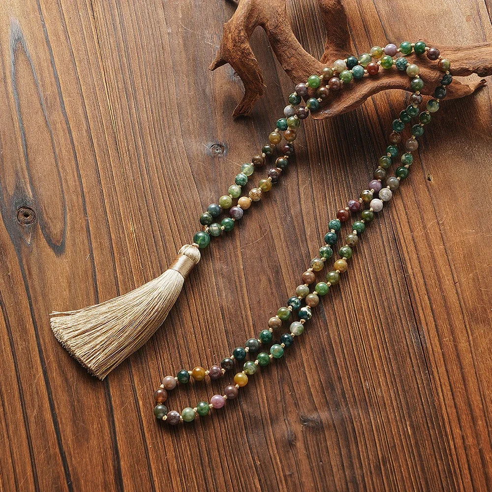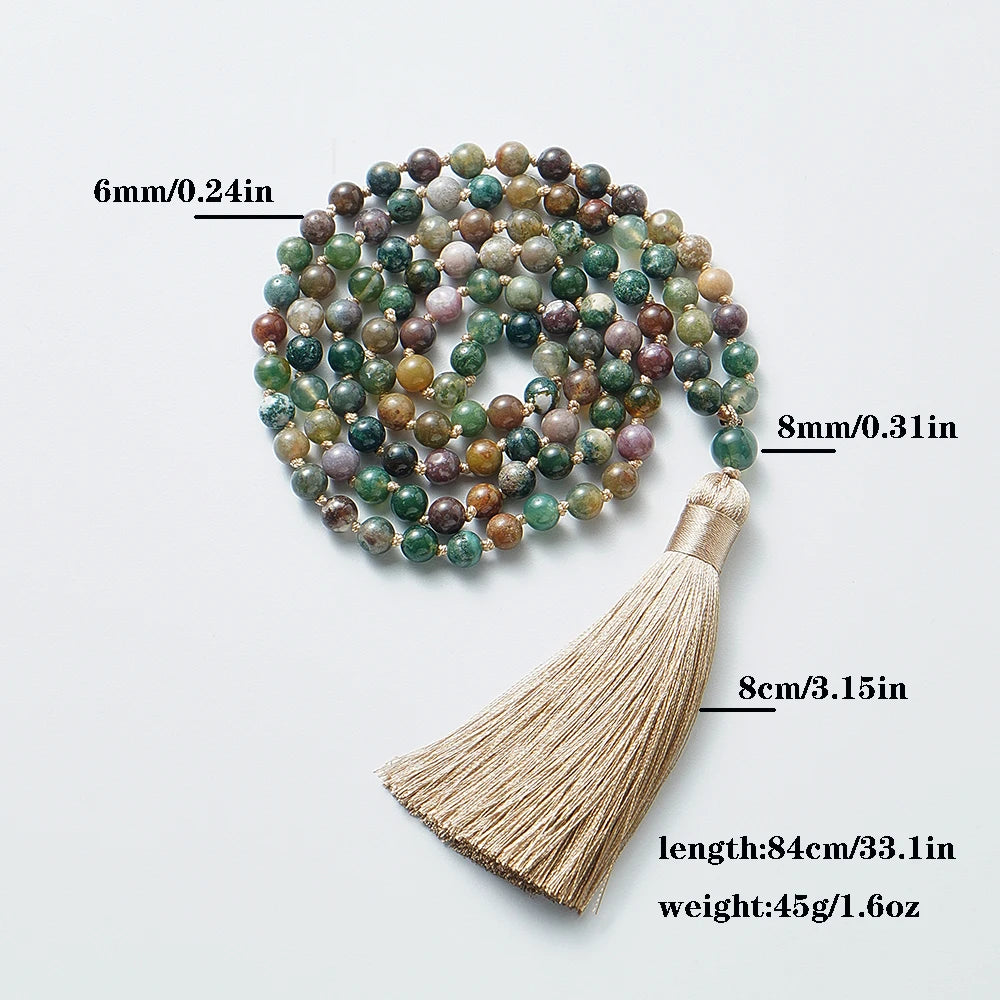 This 108 bead mala necklace features genuine Indian onyx colorful gemstones, with each 6mm bead creating a beautiful tool for meditation and spiritual practice.